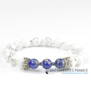 Ce bracelet composé de perles de howlite et pierres de lune, favorisera la digestion et aidera lors de régimes pour limiter la sensation de faim. La howlite régule l’hypertension artérielle souvent associée au stress. La pierre de lune associée à la howlite contribuera à résoudre les problèmes de stérilité chez la femme, régulera les cycles menstruels, stabilisera le taux hormonal après l’accouchement ou lors de la ménopause. La pierre de lune facilitera l’endormissement. Ce bracelet soutiendra un régime amaigrissant grâce à son atout « sérénité ».