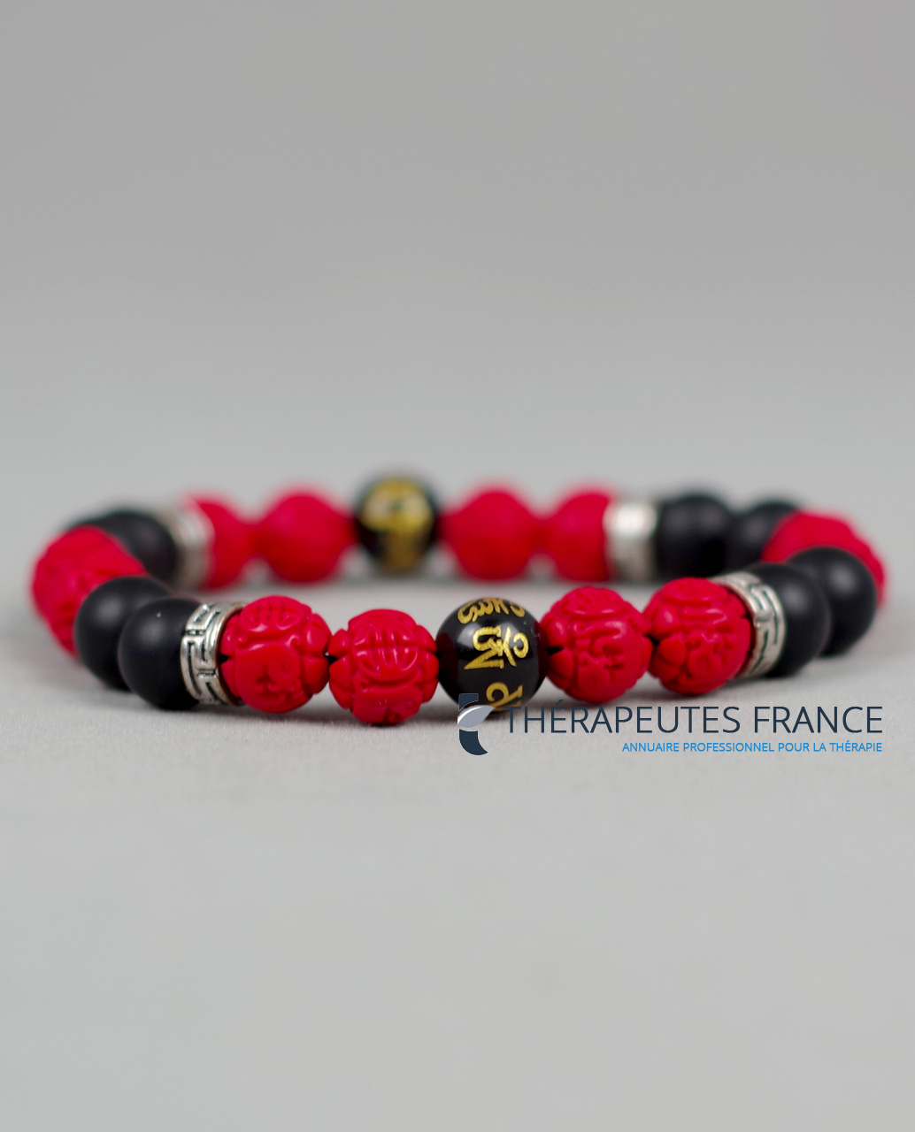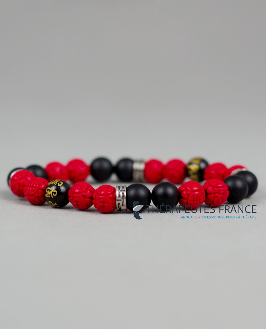 Les perles d'Agate Noire apportent une touche de mystère et de sophistication, tandis que le Cinabre, une pierre aux propriétés protectrices, se marie de manière subtile avec l'Obsidienne Noire, connue pour ses propriétés équilibrantes et sa beauté hypnotique. Les gravures fines sur la perle d'Obsidienne Noire ajoutent une dimension artistique et symbolique à ce bracelet unique. Porter ce bijou va au-delà de la simple parure : il vous enveloppe dans un cocon de protection, tout en s'inscrivant dans les tendances actuelles de la mode. Vous exprimerez votre style avec une élégance inégalée, tout en bénéficiant de l'énergie bienfaisante du Cinabre qui vous accompagnera au quotidien.